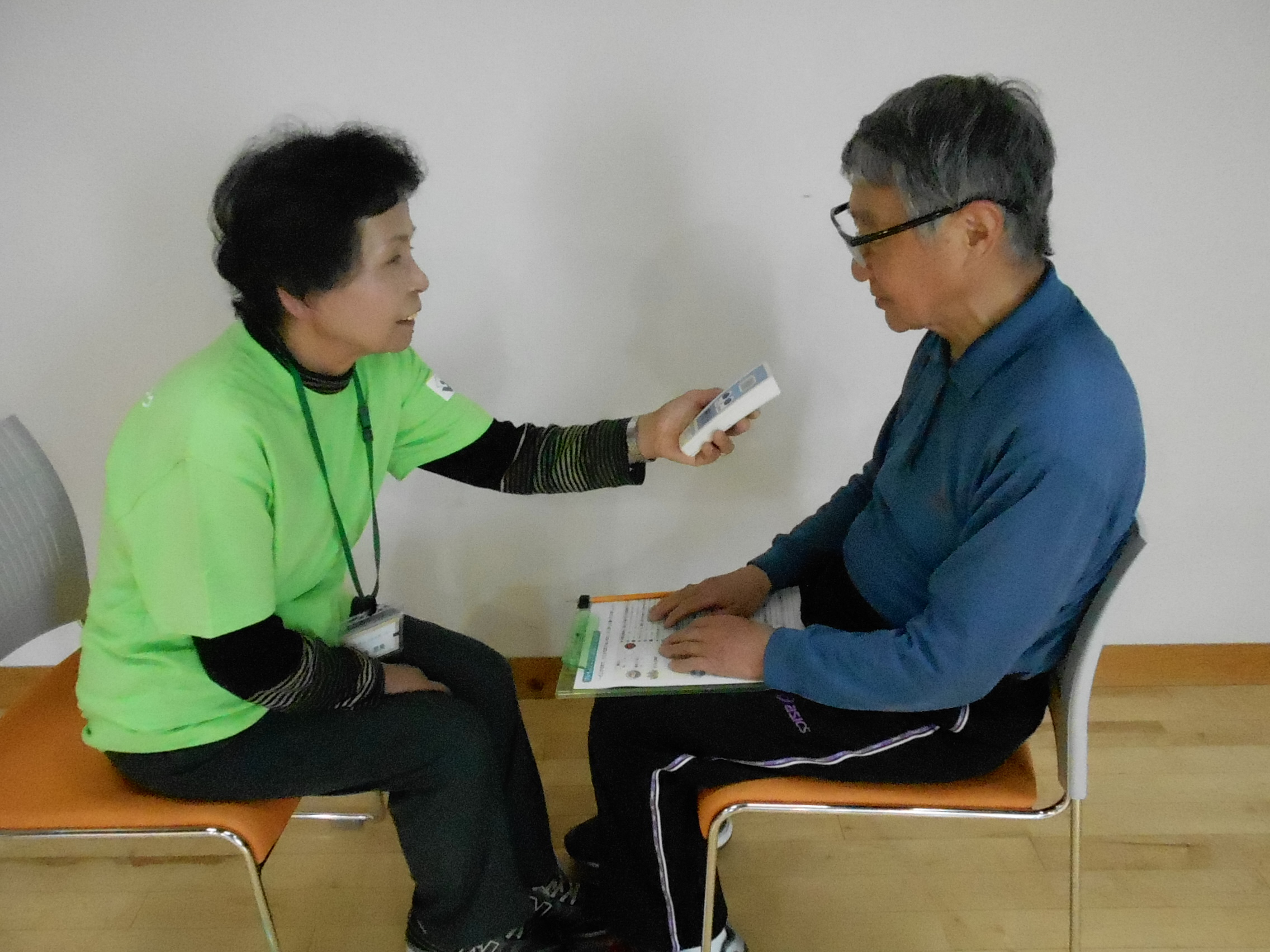 お口の健康度を見るために、機器を使って滑舌のレベルを確認します。5秒間に何回、「タ」(もしくは「カ」)を発音できるかカウントします。口周りや舌の筋肉が弱っていないか調べることができます。