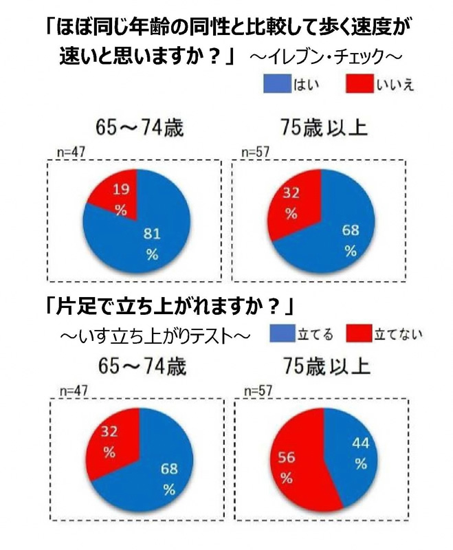 いす立ち上がりテストでは、74歳以下の68%の方、75歳以上の44%の方が片足で立ち上がれました。