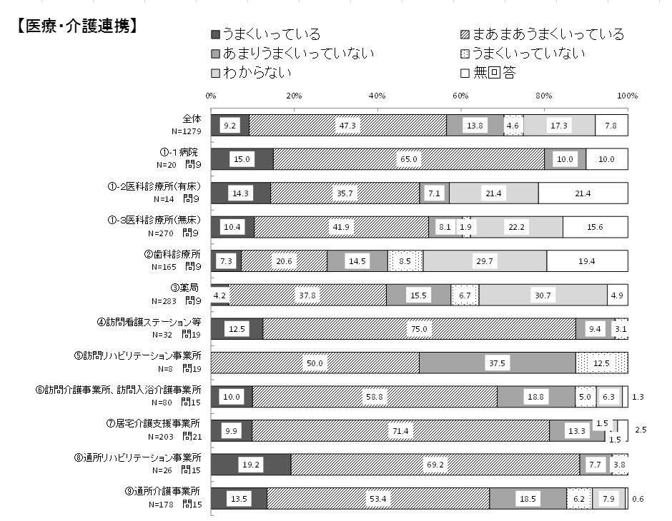 また、本市が平成29年度に実施した「在宅医療の提供と連携に関する実態調査」では、「うまくいっている」と「まあまあうまくいっている」を合わせた回答が、全体として1,279件のうち723件(56.5%)、「あまりうまくいっていない」と「うまくいっていない」を合わせた回答が235件(18.4%)となっています。