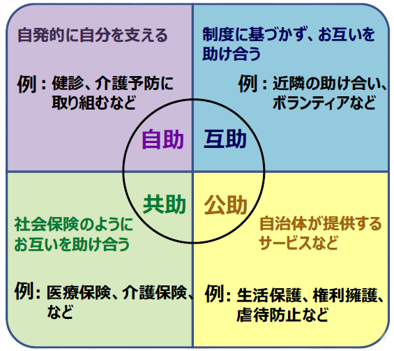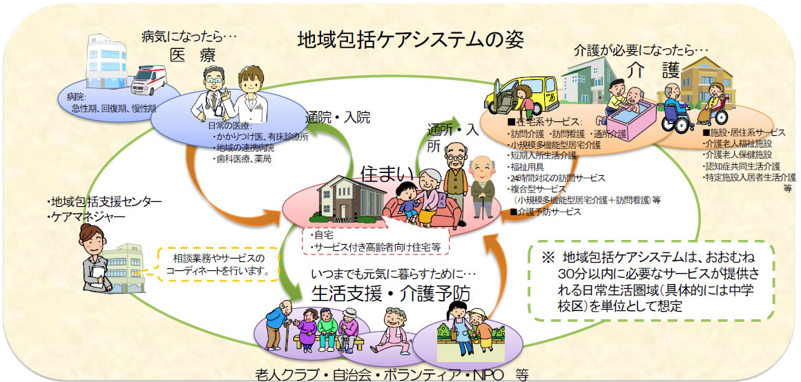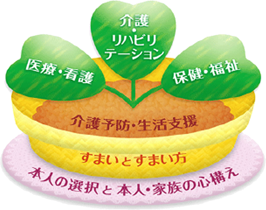 - 植木鉢・土のないところに植物を植えても育たないのと同様に、地域包括ケアシステムでは、高齢者のプライバシーと尊厳が十分に守られた「住まい」が提供され、その住まいにおいて安定した日常生活を送るための「介護予防」「生活支援」があることが基本的な要素となります。そのような養分を含んだ土があればこそ、初めて、専門職による「医療・看護」「介護・リハビリテーション」「保健・福祉」が効果的な役目を果たすものと考えられます。