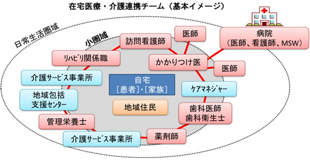 本市は、高齢者が医療や介護が必要となっても、住み慣れた自宅でずっと最期まで自分らしく暮らせるようにするため、平成28年度から市独自に、全国的に定める圏域よりも小さな圏域(小学校区程度)において医療・介護専門職の連携体制を構築する事業に着手し、現在その対象区域のさらなる拡大に取り組んでいます。