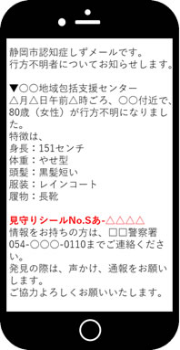認知症しずメールに、“見守り協力者”としてご登録いただきますと認知症高齢者の方の行方が分からなくなった際に右図のようなメールが届きます。